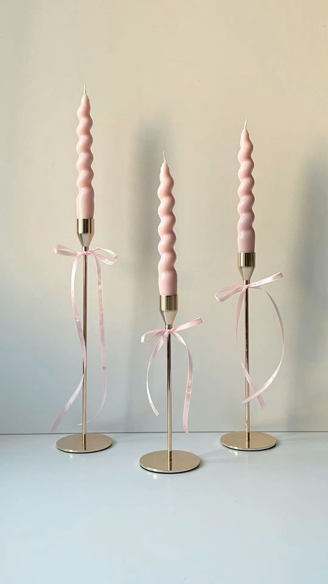 Three candles with an elegant spiral design in a calm pink color, decorated with soft satin ribbons. Placed on a gold metal stand, suitable for dinner parties, photo sessions or add a romantic touch to any corner of the house.
